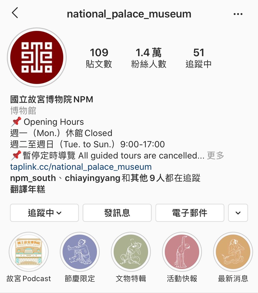 最後要介紹的,是(終於)在去年12月底正式開張的國立故宮博物院 (National Palace Museum) Instagram帳號。雖然目前這個帳號的發文特色還不是很明確,但看得出故宮是想透過比較幽默風趣的方式將館藏的中國藝術品融入大家的生活之中。