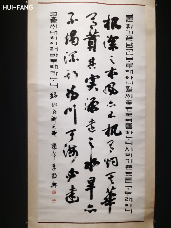 其中,我對韓國人李敦興《龍飛御天歌行草軸》的作品印象深刻,他除了透過瀟灑濃墨的漢字詩詞來讚頌朝鮮王朝的歷史之外,還在長軸左右兩邊寫了端正的諺文(現代韓文前身),字裡行間透露著身為大韓民族的驕傲,呈現書法傳到韓國後不同的文字表現。