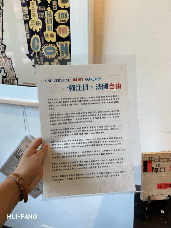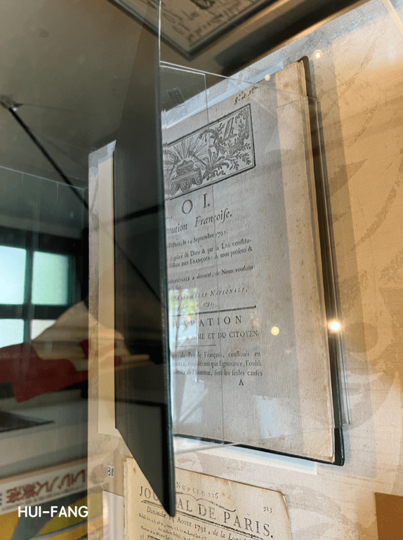 隨著你閱讀這篇討論法國自由的文章,會發現這裡看似隨意與隨機擺放的物品其實也都與「自由」相關。其中,我最印象深刻的是放在玻璃展櫃裡的1792年版法國憲法,沒錯,你沒看錯,那本黑色封面的老舊書籍,就是230年前確立法國自由和平等原則的憲法本人。而憲法旁邊竟然還有18世紀啟蒙運動代表人物伏爾泰1723年出版的著作,以及法國作家左拉1901年出版的《真相在行進》的抗爭文章集等等,都是非常難得能夠在臺灣親眼看到的古董級法國圖書文獻。