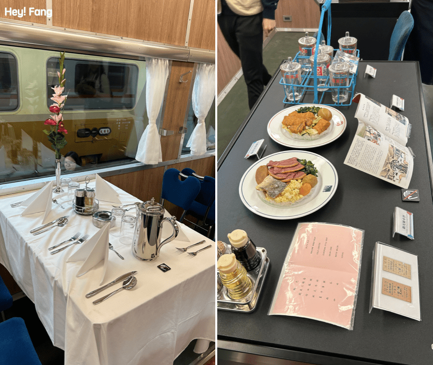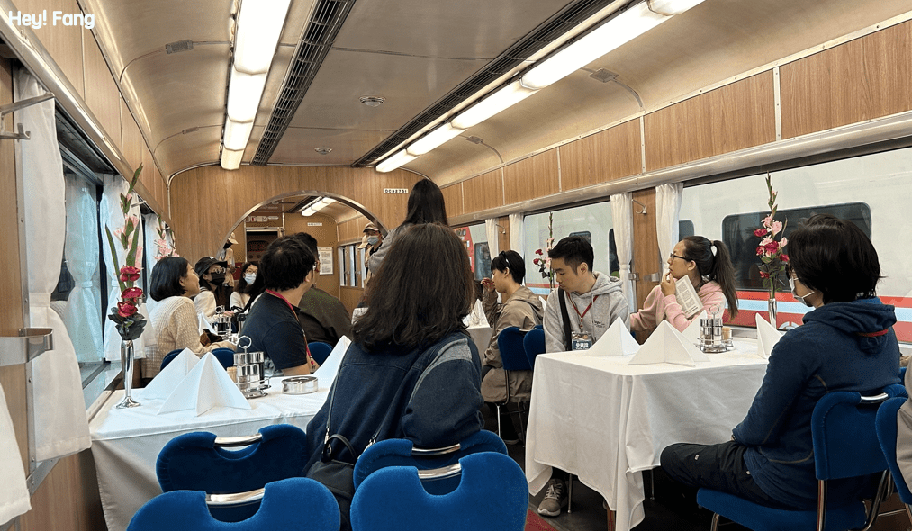整趟導覽最讓我印象深刻的部分,是導覽員帶著大家走入1960年代最高級的初代觀光號車廂內,感受七十年前外國賓客和少數臺灣有錢人在餐車裡面用餐的待遇。博物館根據老照片還原了車廂內部模樣,放上桌花、餐具、西餐和中餐的菜單,並且重新訂製當年深藍色的絨布椅,佈置得十分用心,彷彿穿越時空一般。