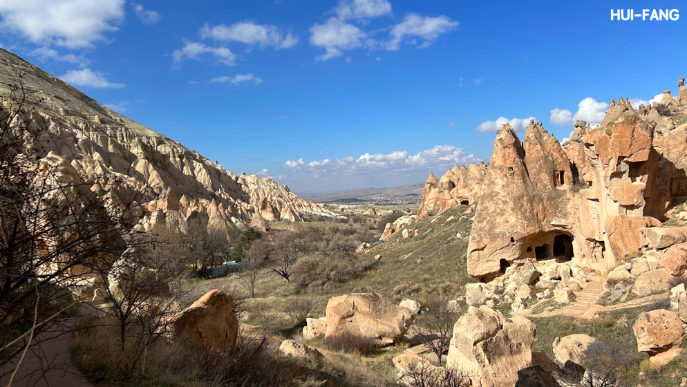 我很喜歡當我走在這三個景點時,腳下踩著的碎石頭,以及圍繞身邊的火山熔岩地形,那不經讓我開始沈浸與想像過去卡帕多奇亞居民在洞穴裡燒飯、聚餐、向神祈禱的生活。另外,在兩個戶外博物館的洞穴教堂中,雖然教堂牆上與天花板的壁畫已經相當斑駁,但還是能看到拜占庭帝國時期基督徒從幾何圖形到複雜神像的宗教美學轉變,有種不可思議的美感。