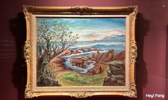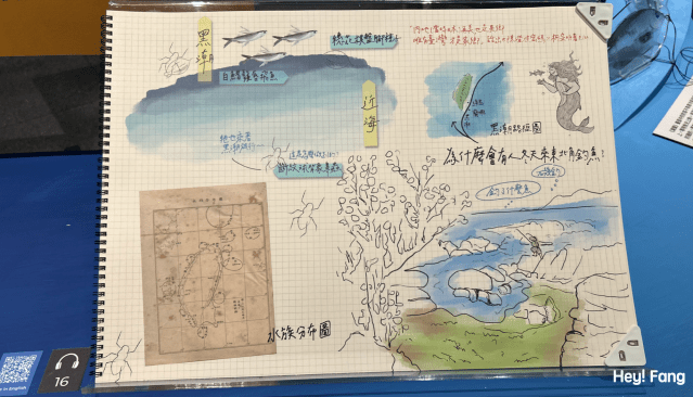 其中,最讓我印象深刻的畫作,是描繪東北部海岸鼻頭角一帶風景的《濤聲》,在這幅彷彿能聽到海浪聲拍打岸邊的畫作裡,觀眾得以跟隨著博物學家的筆記,一起認識畫中葉片稀疏的濱海植物、猜測垂釣者可能會釣到的魚類等等。而且策展團隊還真的去東北海岸錄了一段海邊的聲音,讓觀眾透過五感體驗沈浸於畫中。
