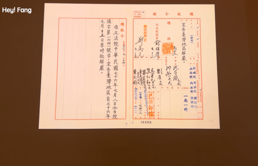 相比之下,《重返1987——解嚴檔案特展》的展場風格又更加戲劇化。從戲院場景、學校教室到街頭選舉車重現,觀眾彷彿走進沉浸式劇場。然而,在這樣豐富的視覺語言之中,有時候會忽略真正的檔案在哪裡。直到展覽最後,當我看到那份「總統府宣告解嚴的公文」,我才意識到:這是整個展覽最關鍵的檔案!